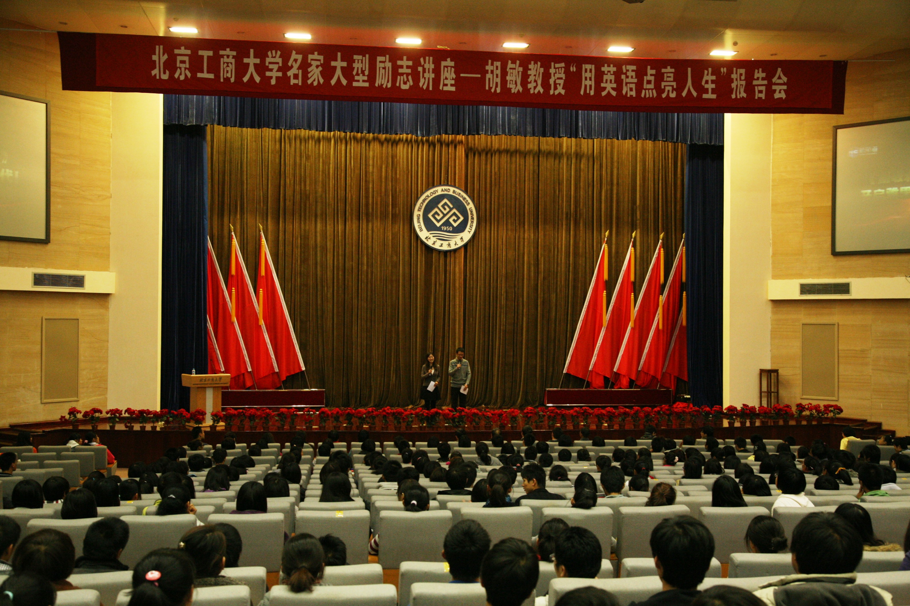 10月19日晚,名家大型勵志講座——胡敏老師“用英語點亮人生”大型公益報告會在我校良鄉校區舉行,報告會由校團委主辦,邀請了著名英語培訓專家、新航道國際教育集團總裁兼校長胡敏老師來我校做講座。校黨委副書記盧思鋒、團委書記呂良出席報告會。