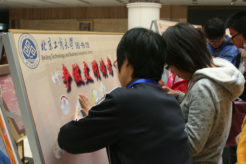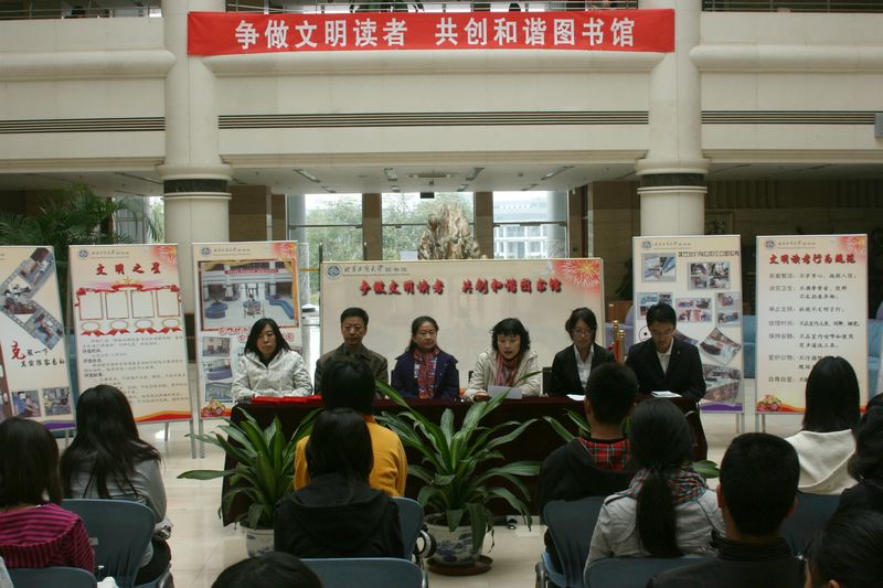 10月20日下午,“爭做文明讀者 共創和諧圖書館”宣傳月活動在良鄉校區圖書館大廳正式啟動,圖書館各部門主任、圖書館學生管理委員會全體成員及30余名熱心讀者參加了啟動儀式。