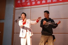 由北京市曲劇團王振聲老師為同學們表演的“手上功夫”魔術(shù)將表演推向了高潮。他為同學們獻上了之前僅在中央電視臺表演過的他的“獨家”魔術(shù),今日同學們能夠親臨現(xiàn)場觀看表演,可謂是大飽眼福。他精湛的技藝和幽默的語言深深地吸引著同學們。他用彩色綢布、玻璃杯、撲克等最簡單的道具給同學們展示了一個又一個精彩的魔術(shù)。其表演手法之快令同學們驚嘆不已,場上掌聲不斷。有趣的相聲表演,巧妙地融合了“說、學、逗、唱”四種相聲的表演形式,引人入勝,讓同學們在歡笑聲中了解傳統(tǒng)文化的精髓。國家一級二胡演奏演員袁迪為同學們表演了一曲二胡獨奏《賽馬》,演奏過后,又為同學們額外加演了一曲他自拉自唱的《草原上升起不落的太陽》,贏得了同學們的陣陣掌聲。