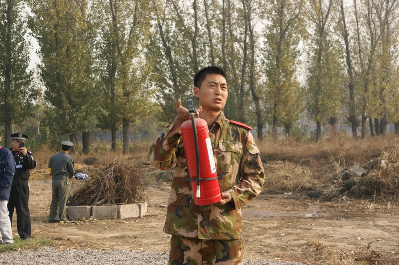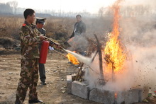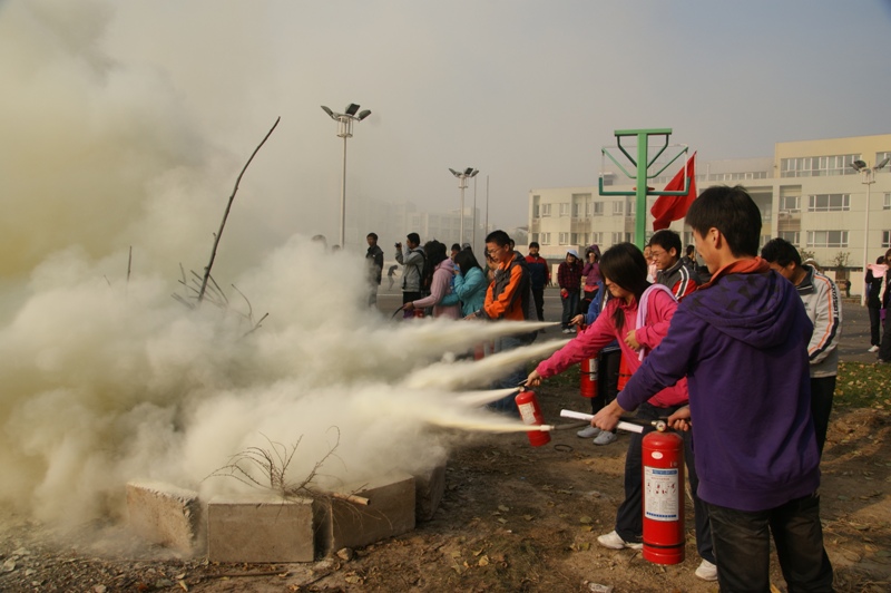 在消防隊(duì)員的示范指導(dǎo)下,所有參演師生分別在八個(gè)火堆前用滅火器進(jìn)行了滅火演習(xí)。