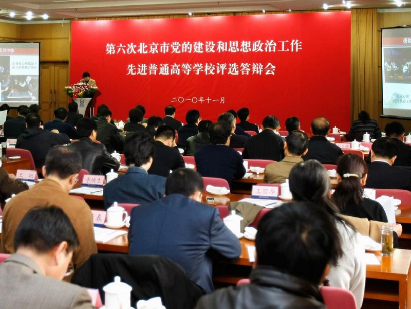 11月9日,第六次北京市黨建和思想政治工作先進普通高等學校評選答辯會在北京會議中心舉行。評審委員會全體專家以及黨的關系隸屬于北京市委的60所北京高校黨委書記、主管領導出席了會議。會議由市委教育工委常務副書記劉建主持。學校黨委書記孫堯東同志代表學校黨委作了題為《加強黨的建設,推進學校轉型,全面建設特色鮮明的教學研究型大學》的陳述報告。