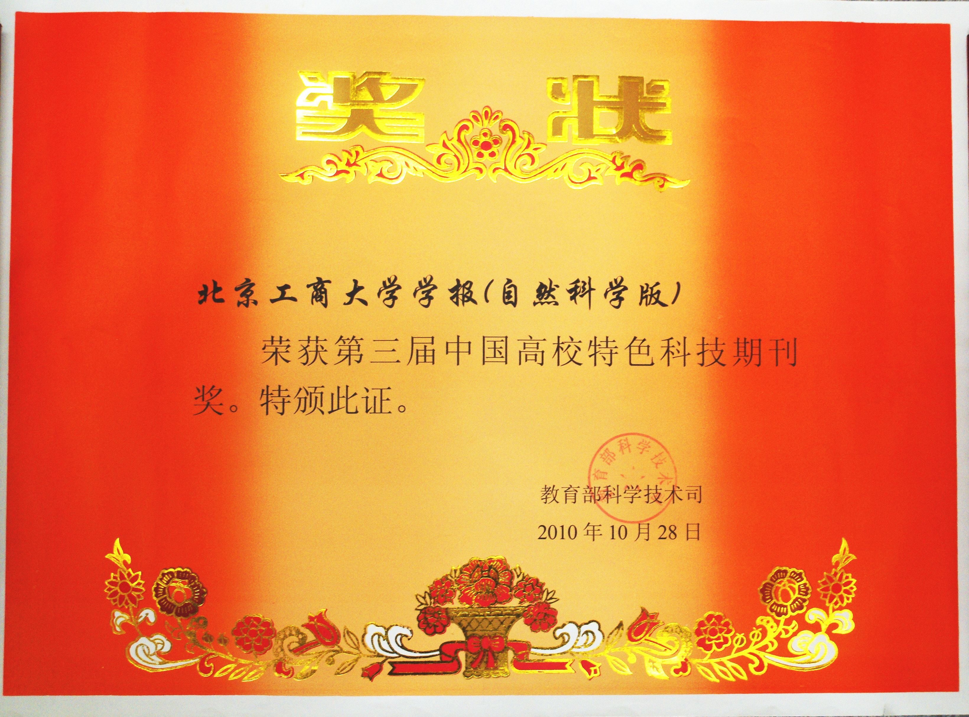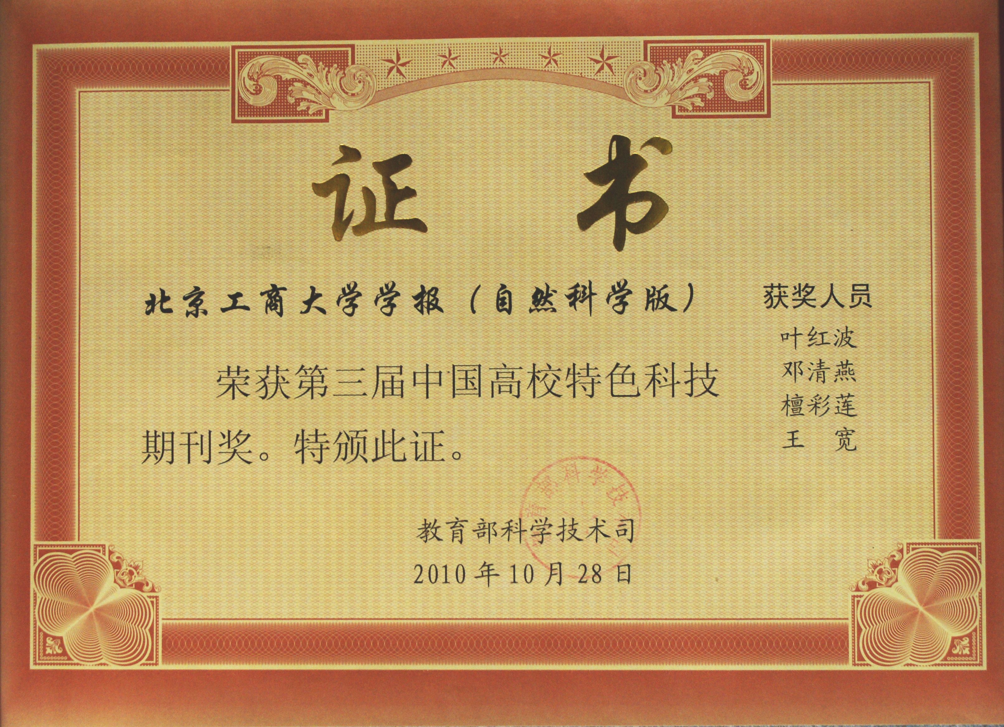 11月6日至11日,中國高校科技期刊研究會在重慶召開第14次年會及第3屆中國高校科技期刊評比表彰會議。我校《北京工商大學學報(自然科學版)》榮獲“高校特色科技期刊獎”。這一獎項是教育部科技司委托中國高校科技期刊研究會組織評選的。該獎項的設立是教育部鼓勵高校學報以本校優勢學科為依托,打破綜合性及千刊一面的辦刊模式,走精品、特色的辦刊方向的體現。我校是自該獎項設立3年來首次獲得該獎項。獲得該獎項的一共有59種高校科技期刊,是從1500多種高校科技期刊中評選出來的。該獎項的獲得是對我校《北京工商大學學報(自然科學版)》轉型為食品科學專業期刊以來,所做工作的高度贊揚和充分肯定。