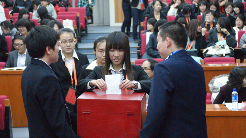 民主選舉,投我一票。在大會執行主席左燁主持通過候選人選舉辦法,總監票人李森主持通過監票人產生辦法后,激動人心的時刻到來了。由大一、大二同學民主推薦的二十名候選人,逐一上臺進行競選演講。每位候選人簡要闡述了競選崗位的優勢和目的,希望得到代表的支持。但競爭是激烈的,在這20位候選人中,只有15位能夠當選,并組成外國語學院第11屆團總支、學生會的新領導團體。競選演講結束后,代表們開始投票,以選出他們心目中最有實力的同學。
