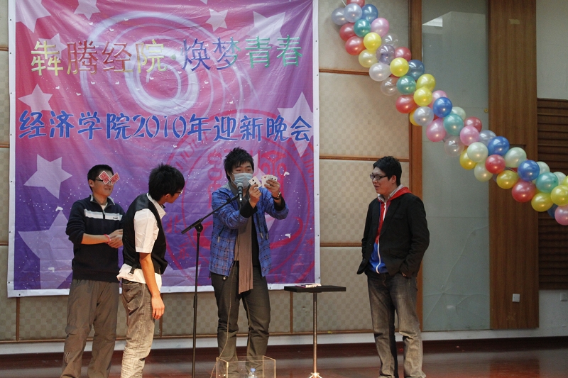 繁華盛世、燈火迷離,寒來暑往志凌云。犇騰經院、煥夢青春,辭舊迎新舞升平。12月15日,經濟學院2010迎新晚會在良鄉校區舉行。校團委李明英老師、校團委徐鑫老師、經濟學院團總支書記王海偉、經濟學院08級輔導員陳妍、09級輔導員向小平及10級輔導員張宸、校學生會主席張靜薇、經濟學院學生會主席遠震、其他學院及組織的主要學生干部等作為嘉賓出席了本場晚會。