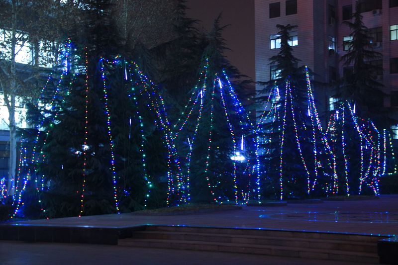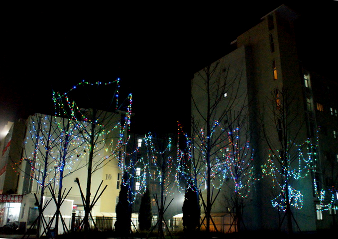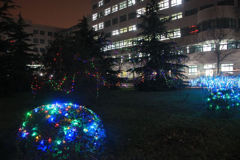 從小樹,到五角星,從單色系到五彩繽紛,我校良鄉(xiāng)校區(qū)生活區(qū)、教學(xué)區(qū)和阜城路校區(qū)西區(qū)綜合樓前、東區(qū)耕耘樓前,將近900條五彩串燈、130根流星燈將學(xué)校裝點一新。頂著冷風(fēng),冒著嚴(yán)寒,我校后勤維修中心的30多名師傅,以“和諧校園,歡樂校園”為主題,用兩天時間,將往日光禿禿的樹上掛滿了五顏六色的彩燈,將校園的夜晚點綴得絢麗多彩,情趣盎然。