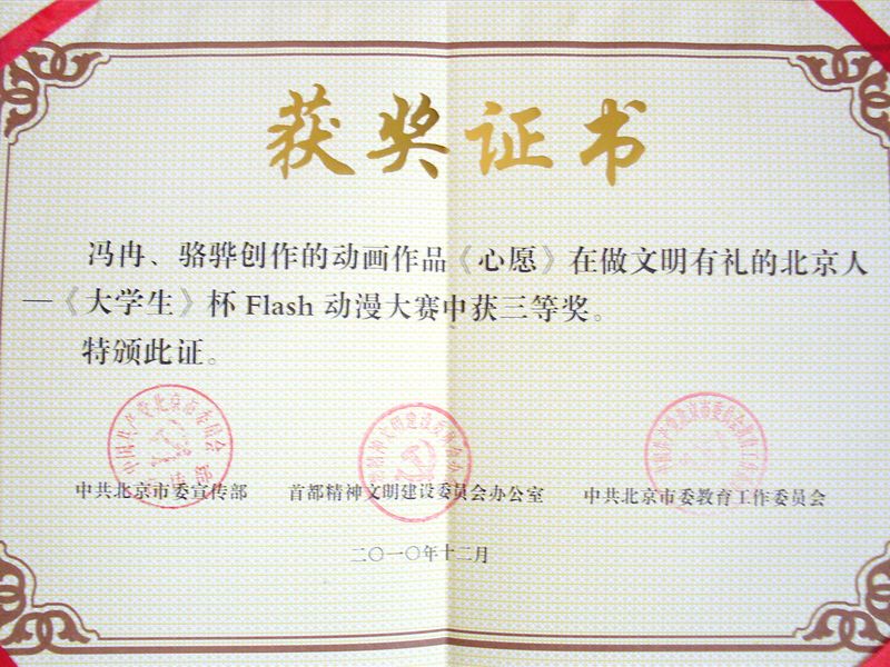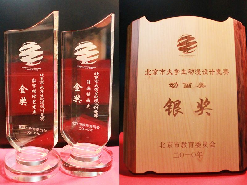 在剛剛結束的北京市教委主辦的2010年首屆北京市大學生學科競賽的動漫設計類競賽中,藝術與傳媒學院數字娛樂專業08級學生唐靈杰的兩部作品分別榮獲了動漫設計競賽和漫畫插畫類兩項金獎,劉濱同學的作品獲得了漫畫插畫類銀獎。另外在北京市委宣傳部主辦的大學生flash大賽中,08級學生駱華、馮冉的作品也獲得了三等獎。