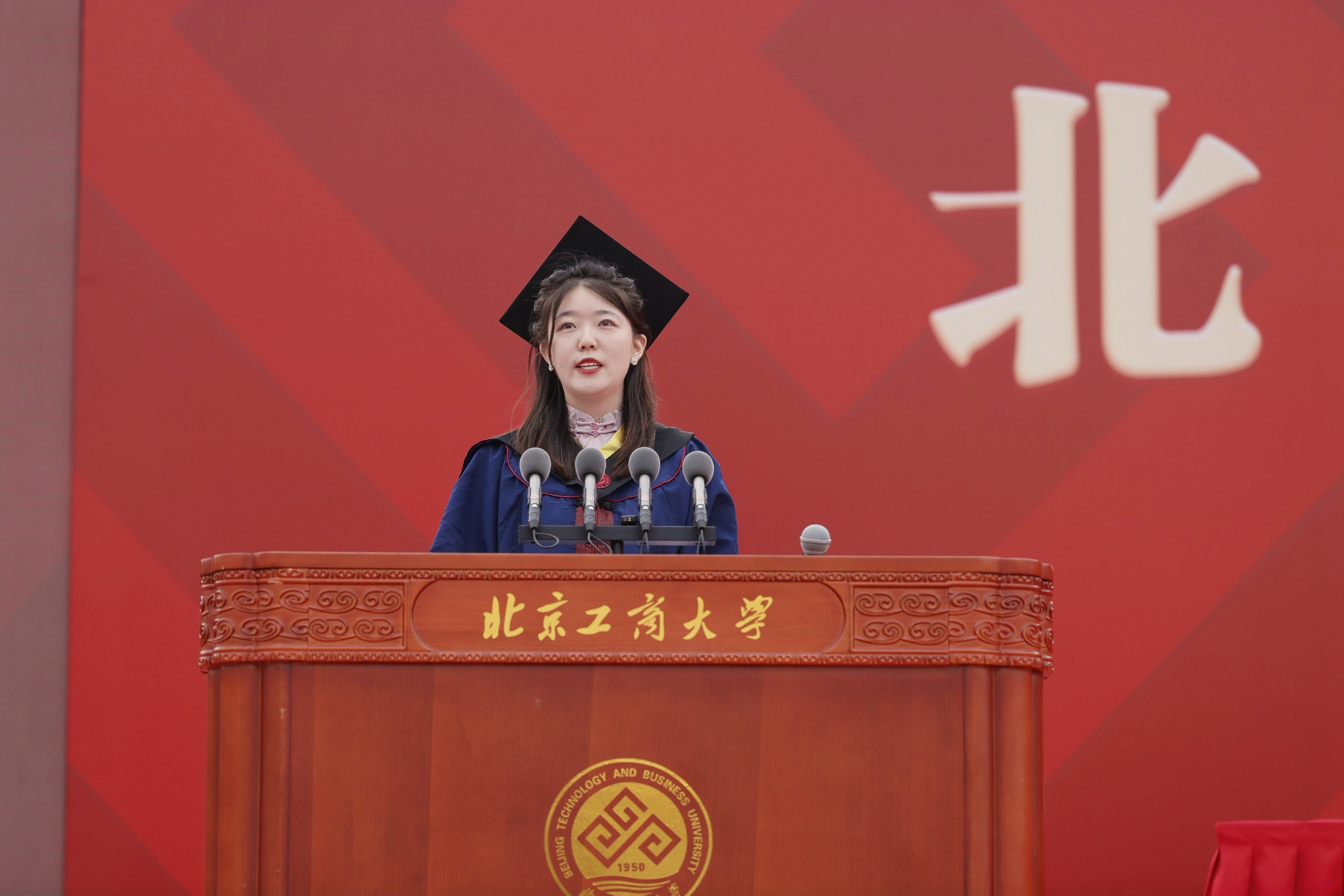 研究生畢業生代表、食品與健康學院食研212班李欣萍發言。她表示,自2015年本科入學以來,她在北工商度過了九年時光,北工商見證了她的青春,她也見證了北工商的榮光。回望過去,在北工商學習生活的一點一滴都還歷歷在目,北工商的每一個角落都記錄著她和同學們的奮斗和成長。入學時的興奮或許已經模糊在北工商努力的日夜卻依然清晰。在畢業來臨之際,她衷心祝愿母校風華正茂、永續華章;祝愿老師工作順利、桃李滿疆;祝愿所有的同學一帆風順、一路繁花,秉承“求真、立德、勤奮、創新”的校訓,以青春“小我”書寫強國“大我”。