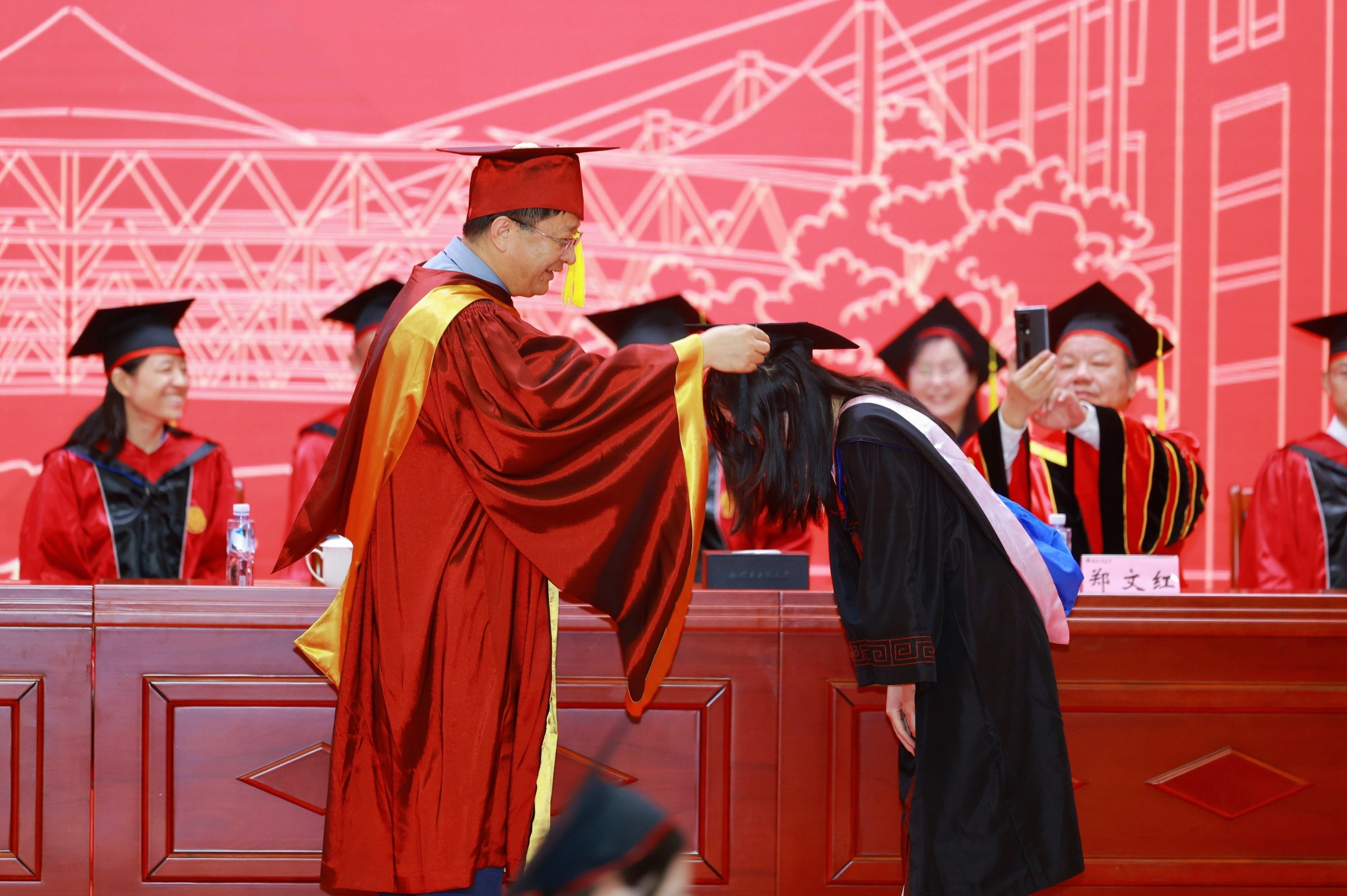 黨委書記黃先開,黨委副書記、校長郭建華為本碩博畢業生代表撥蘇正冠,希望畢業生都能堅定理想信念,擔當時代責任,接續奮斗開啟人生新篇章。全場掌聲雷動,為這榮耀一刻喝彩。