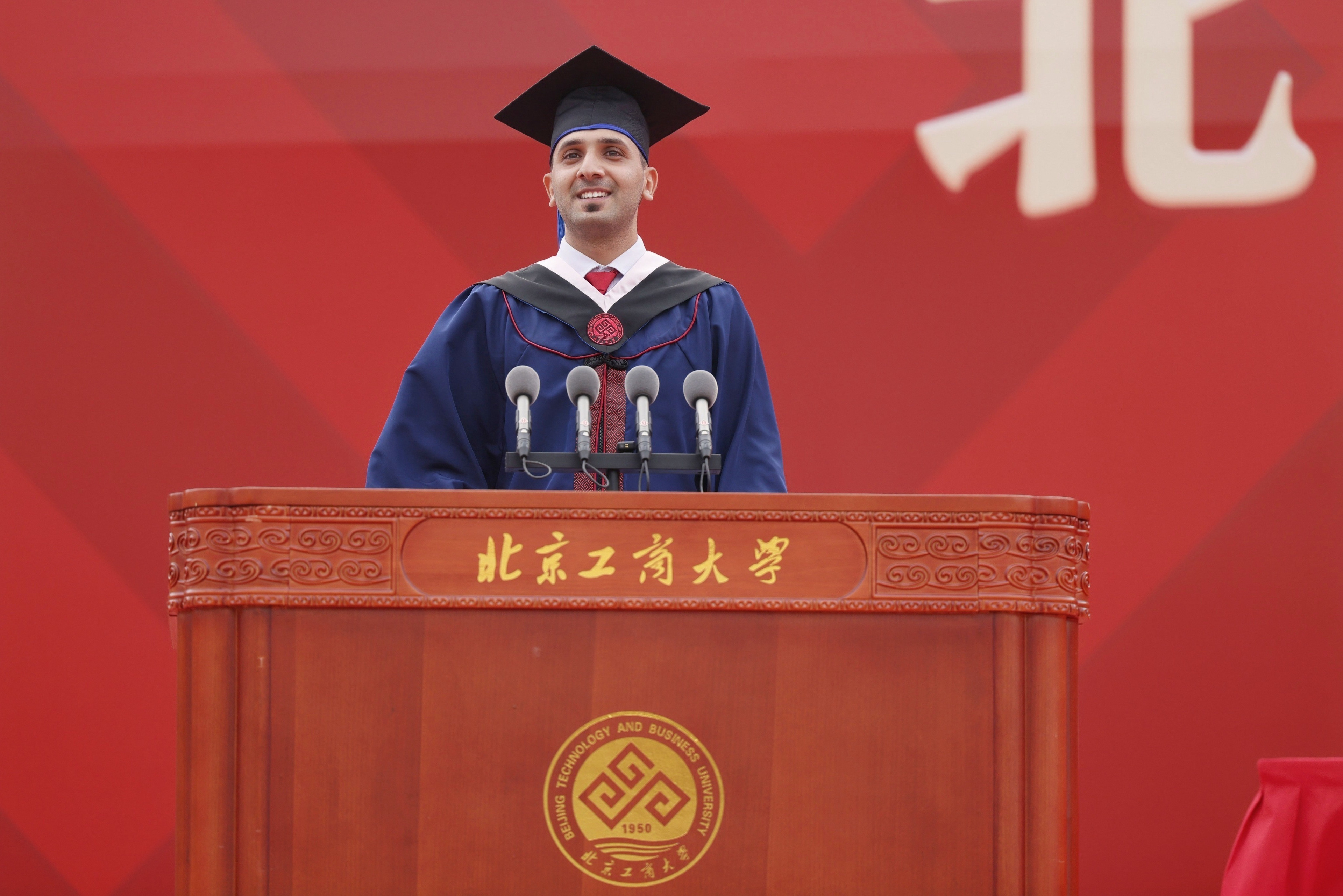 回顧求學之旅,留學畢業生代表Jad表達了自己與其他留學生對北工商衷心的感謝和深深的祝福。他要感謝中國政府給予他與其他留學生來華學習的機會,為他們打開了認識中國、認識世界的窗口;感謝北工商為他們提供了學習和實踐的平臺,讓他們學習了前沿知識,提升了專業技能,探索了發展方向;他要感謝在北工商的同窗朋友,友情讓他在北工商的生活充實而多彩。他祝愿北工商走向國際一流,祝愿老師同學萬事順意,希望世界能永遠充滿愛與和平。