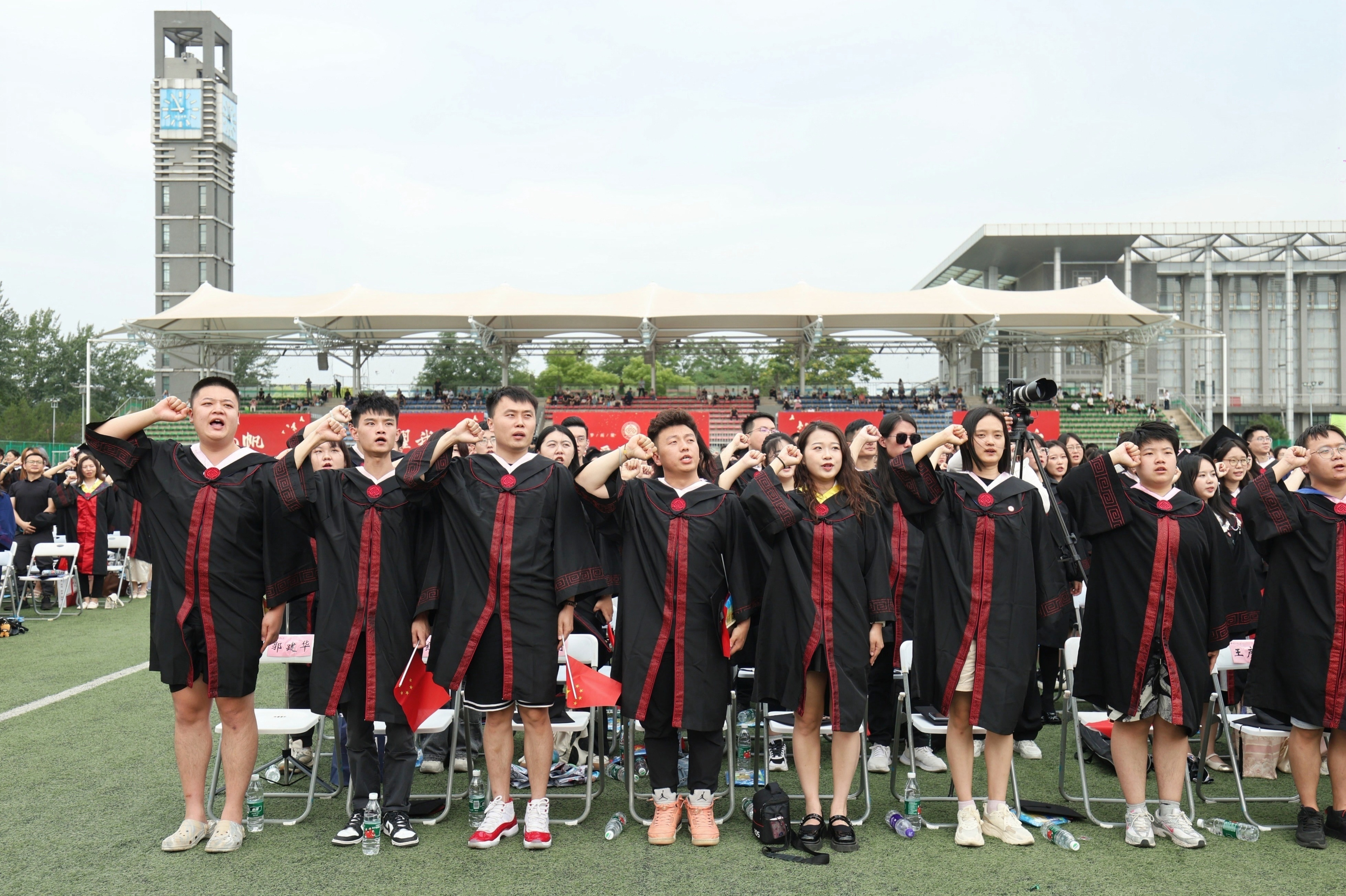 優秀畢業生代表發言完畢后,全體畢業生起立,高舉右拳齊聲宣誓。畢業生將銘記工商校訓,感念母校師恩,賡續紅色基因,奉獻祖國人民,勇擔時代使命,無憾盛世青春,自強自信自尊,創業創造創新。揚帆遠航,耀我工商!鴻鵠萬里,國之棟梁!為國家繁榮昌盛,為民族偉大復興,貢獻畢生力量。