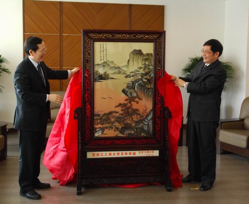 2011年適逢浙江工商大學建校100周年,譚校長代表北京工商大學全校師生員工向浙江工商大學百年校慶捐贈屏風一樽,并預祝百年校慶各項活動圓滿成功。佇立錢塘江畔,耳邊潮水湯湯,兩校領導同勉要繼承兄弟高校情誼,在實施科教興國和人才強國戰略中,勇立改革創新、特色名校、加快轉型、科學發展的歷史潮頭。