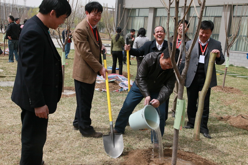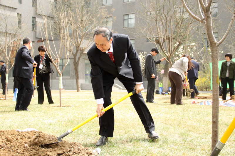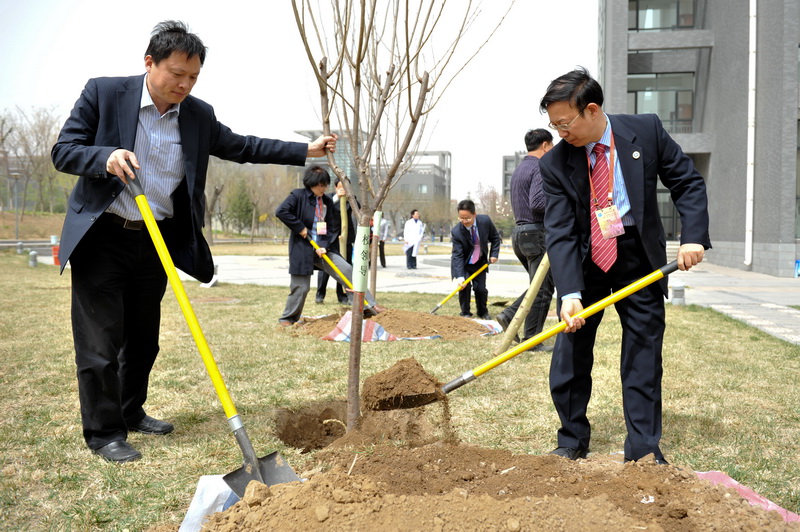 4月9日中午,春光明媚,萬物復蘇。參加完“雙代會”開幕式的代表們來到良鄉校區文科二、三號樓西側的綠地,親手種下了櫻花26棵、移植海棠5棵;為游泳館、科研樓南側綠地銀杏樹培土22棵。