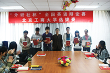 本屆“外研社杯”全國英語辯論賽北京工商大學(xué)選拔賽從3月初報(bào)名開始,4月初比賽圓滿結(jié)束,得到了教務(wù)處及各個(gè)學(xué)院的支持,也受到了外研社的表揚(yáng)和獎勵。