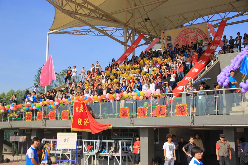隨后,各院、部進行了精彩的學生啦啦操展示賽。作為今年運動會開幕式首次出現的節目,啦啦操由各院系師生精心設計編排,將藝術與體育完美地結合在一起,充分體現了廣大師生的智慧與創意。動感十足的機器人舞,充滿春天氣息的芭蕾舞,色彩繽紛的雨傘舞,青春靚麗的紙扇表演,優雅迷人的華爾茲……各具特色的節目輪番上演,讓人目不暇接;形式多樣的表演,為觀眾獻上一場精彩的視覺盛宴。房山區體育局副局長郭東云贊道:“各個學院的表演都很有創意,充分體現了大學生的創新精神。”