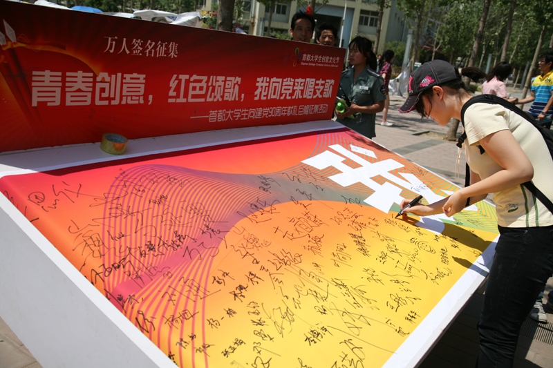 活動現(xiàn)場還舉行了首都大學(xué)生向建黨90周年獻(xiàn)禮萬人簽名巨幅征集活動。來往的同學(xué)紛紛在征集板上簽名,以表達(dá)對黨、對祖國的祝福和感恩之情。