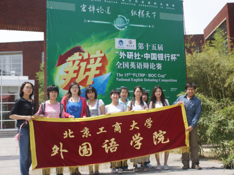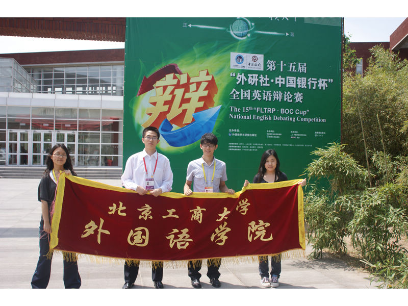 經歷3、4月份的幾輪選拔賽后,北京工商大學賽區脫穎而出的英語082班李森、法學院法學093班石雪怡,在領隊外國語學院英語072班王軒的帶領下,同來自全國包括清華大學、北京大學、香港大學、澳門大學等129所高校在內的精英才俊齊聚北京外研社國際會議中心,進行了一場場高水平對決。我校代表隊最終排名第59名,比去年提前近30名。外國語學院英語102班劉菲被選為本次決賽志愿者,為比賽順利進行貢獻了一份力量,并被評為“第十五屆外研社杯英文辯論賽”優秀計時員。