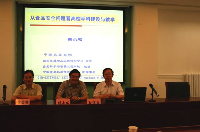 2011年5月20日下午,食品學院和教務處邀請中國農業大學科學研究院常務副院長、著名食品安全專家胡小松教授,在阜成路校區西區綜合樓會議室作了題為“從食品安全問題看高校學科建設與教學”的講座。出席會議的有副校長孫寶國院士、食品學院院長徐寶財教授、副院長曹學麗教授及食品學院全體教師。