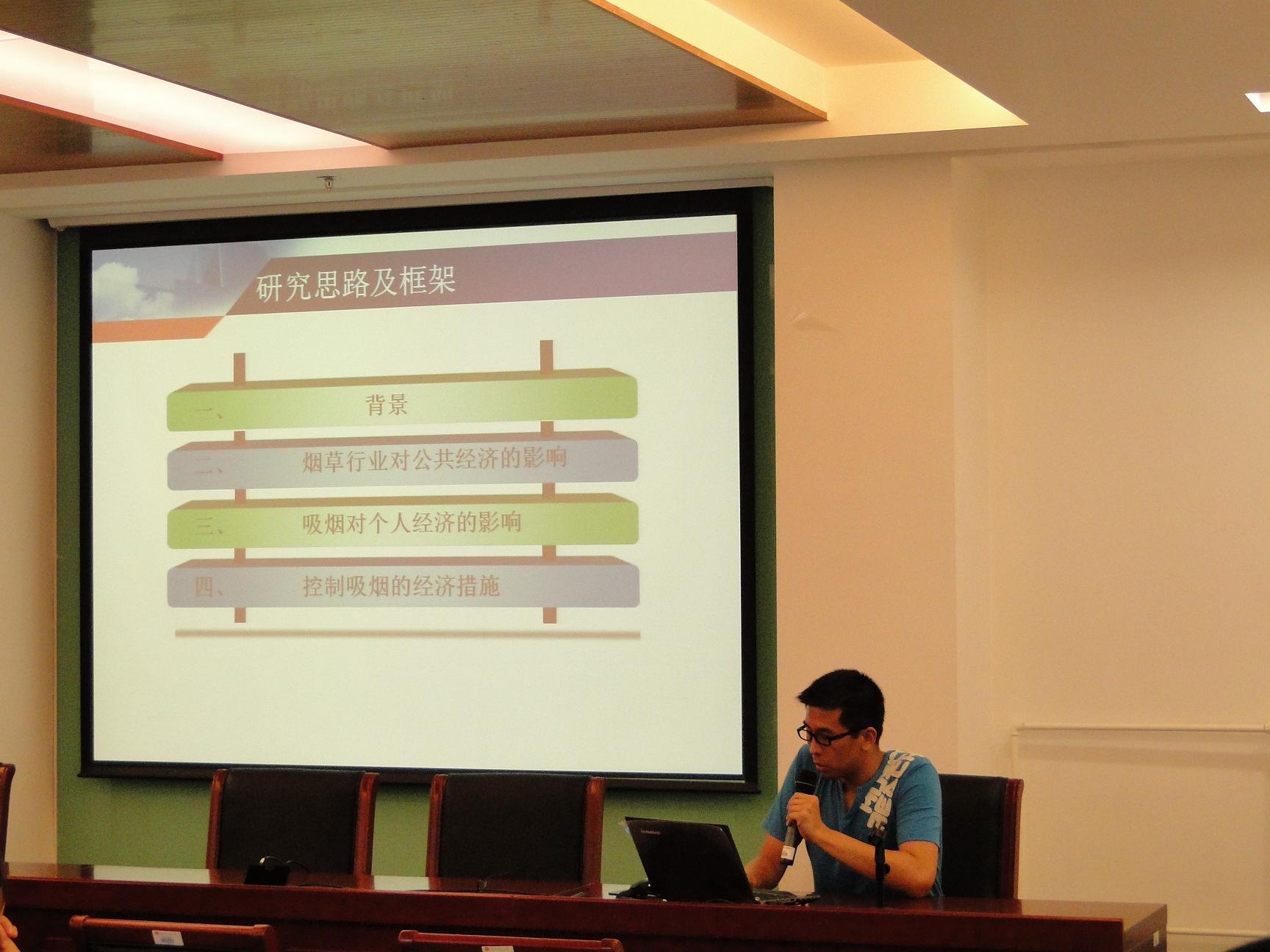 研究生會副主席馬莉同學對世界無煙日的前期宣傳工作情況進行了簡要介紹,并用幻燈片的形式展示了關于無煙日的由來、歷年主題、吸煙對人體的危害等內容。來自商學院、經濟學院、食品學院、計信學院、法學院的研究生們分別從各自專業角度,以吸煙收益模型、控煙的經濟學手段、煙霧化學成分分析及危害、煙霧自動監測報警技術、控煙法律效力和執行方式等作為主題,通過生動的圖片、直觀的模型、詳實的分析,多視角全方位地向大家介紹了如何看待吸煙問題,并提出了以自己的調查分析為基礎提出了可行性解決辦法。