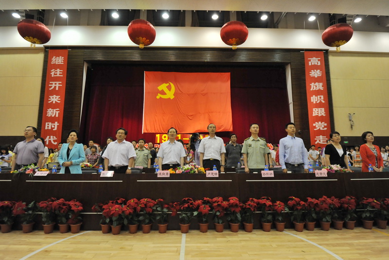 和著臺(tái)上高亢嘹亮的歌聲,臺(tái)下的老師和同學(xué)們拍手打著節(jié)拍,揮動(dòng)手中的黨旗、國(guó)旗,臺(tái)上臺(tái)下熱情互動(dòng),表達(dá)了對(duì)黨的熱愛和努力創(chuàng)造美好未來(lái)的昂揚(yáng)斗志,唱出了對(duì)祖國(guó)的熱愛和對(duì)學(xué)校的祝福。