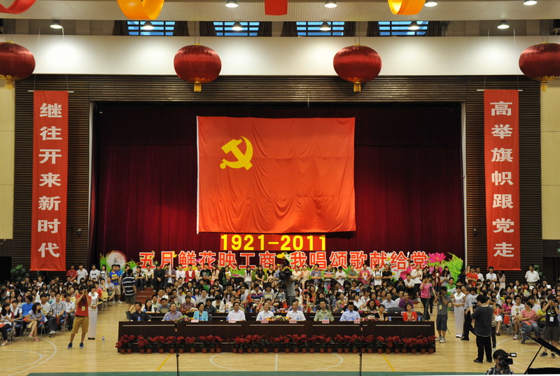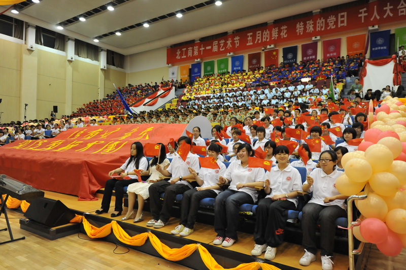 巨幅的黨旗懸掛在舞臺(tái)上,鮮紅的顏色映滿整個(gè)文體館;紅、藍(lán)、黃、綠、紫……穿著各色服裝的同學(xué)們像五月的鮮花盛放在觀眾席上,優(yōu)美的歌聲飄揚(yáng)在今夜的北工商。