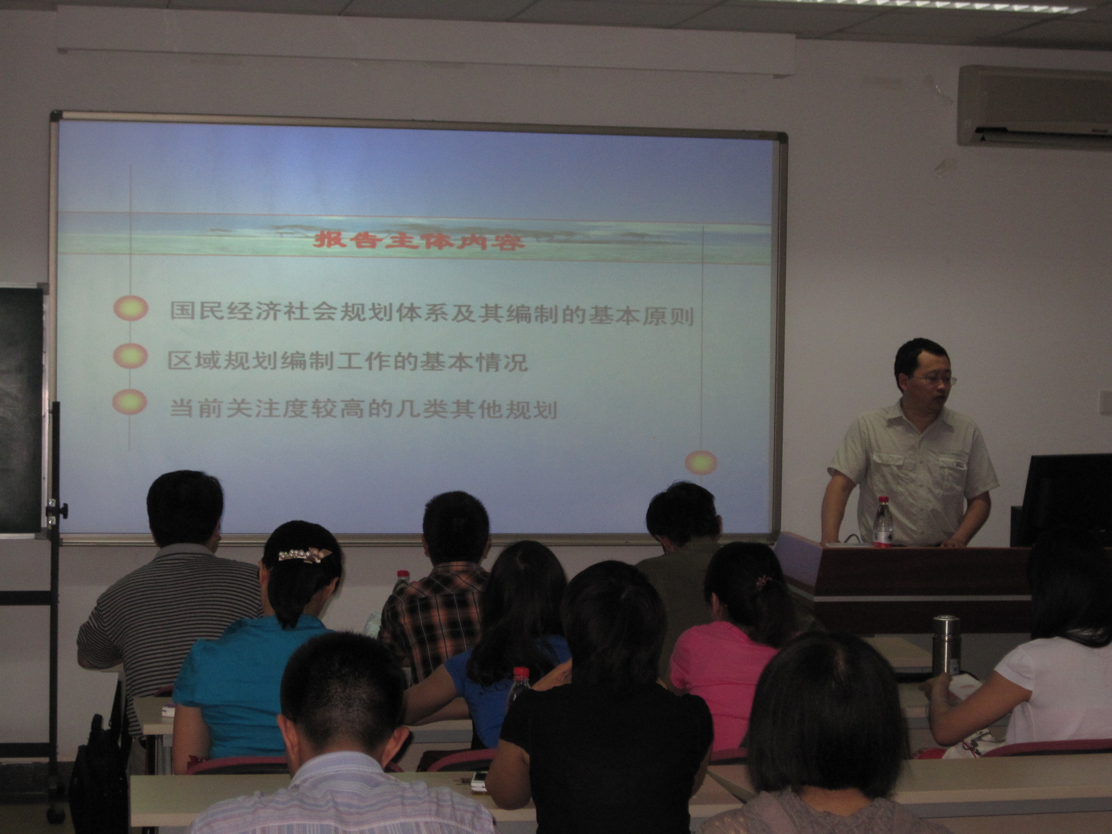 楊蔭凱博士的講座共分三部分:國民經濟與社會發展規劃體系、區域規劃的編制以及當前關注度較高的區域規劃問題。在簡要介紹了當前國民經濟規劃體系之后,楊處長從區域規劃的背景、含義以及當前存在的問題等方面對區域規劃作了詳細說明。他指出,區域規劃作為國家參與宏觀調控的重要手段,反映了國家意志,在帶動地方經濟發展、促進區域協調發展等方面發揮了重要作用。他用翔實的數據和圖片資料向聽眾展示了我國當前區域經濟發展中的問題,從政府視角分析了其原因,并建議在座的師生就一些政府關心的區域問題展開學術研究,為國家的區域發展政策和戰略的制定貢獻力量。他特別就我國的區域發展差距、區域間基本公共服務水平、區域開發以及促進區域協調發展的體制和機制問題進行了分析。最后,他就當前關注度較高的我國區域規劃制定的過程和程序做了介紹。