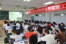 教師評委由各院(部)領導、相關部門領導、教授代表、督導專家代表組成;學生評委從本科三年級學生中隨機抽樣產生。參與評選的每位老師進行十五分鐘現場教學演示,演示順序由學院代表抽簽而定。從現場的教學演示環節可以看出,各位競逐教師進行了認真而充分的準備,教學演示環節積極展現了各自豐富的教學經驗和多元化教學模式,時而熱情洋溢,時而理性透徹,使在場的每位老師和同學都沉浸于知識的海洋。