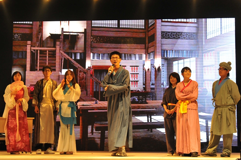 同時,語言類節(jié)目也在文藝匯演中大放異彩。由大一學(xué)生焦雷、陳雪強(qiáng)帶來的原創(chuàng)相聲《初戀那些囧事》一度讓全場的每個角落都洋溢著笑聲。而話劇《武林外傳》更是克服了排練的困難,在再現(xiàn)經(jīng)典的同時加入了自己的改編,從而在充分展現(xiàn)演職人員才藝的同時,也在現(xiàn)場呼應(yīng)的效果上收到了奇效。