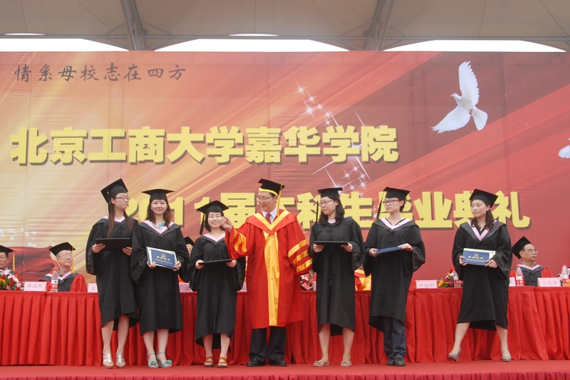 6月29日上午,譚向勇校長出席嘉華學院2011屆本科生畢業(yè)典禮,向獲獎畢業(yè)生及畢業(yè)班代表頒發(fā)了榮譽證書、畢業(yè)證及學位證書。北京工商大學副校長、嘉華學院院長張耘、嘉華學院相關(guān)領(lǐng)導(dǎo)及各系部主任與1300多名畢業(yè)生參加了此次典禮。