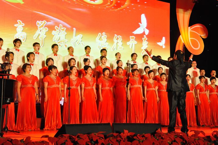 第三部分是主題為“繼往開來”的文藝演出。師生們用精心準(zhǔn)備的紅歌表演表達(dá)對黨的偉大成就的熱情謳歌和對黨90華誕的美好祝福:離退休人員合唱團(tuán)表演的合唱《把一切獻(xiàn)給黨》、學(xué)生合唱團(tuán)表演的男生小合唱《中國軍魂》、獨(dú)唱《江山》、合唱《春天的故事》、《在燦爛的陽光下》、機(jī)關(guān)一合唱團(tuán)表演的合唱《四渡赤水出奇兵》、教工組合表演的小合唱《天邊有顆閃亮的星》、嘉華學(xué)院合唱團(tuán)表演的合唱《在燦爛陽光下》、后勤職工合唱團(tuán)表演的合唱《祖國,我慈祥的母親》、教師獨(dú)唱《永遠(yuǎn)跟黨走》……隨著節(jié)目的進(jìn)行,臺(tái)上大屏幕上播放的視頻帶領(lǐng)觀眾回顧了中國共產(chǎn)黨帶領(lǐng)中國人民從獨(dú)立自主到繁榮富強(qiáng)的輝煌歷程。最后全場起立,齊聲高唱《沒有共產(chǎn)黨就沒有新中國》,洪亮的歌聲響徹云霄。