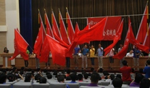 隨后,在激昂奮進的音樂聲中,校黨委副書記盧思鋒親自為各實踐分團授予2011年暑期社會實踐旗幟。13個實踐團代表揮舞著手中鮮艷的旗幟,現場一片熱烈激揚的氣氛,同學們使命感油然而生。