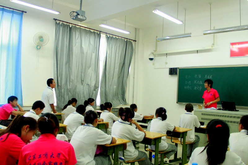 今天是正式開始教學的日子,各個課程逐個開展,其中最吸引人眼球的莫過于新鮮刺激、妙趣橫生的辯論課。經濟學院辯論隊是一只優秀的隊伍,在許多首都高校辯論賽中都取得過突出成績,成員們引領著四個班級71名同學進入了一個新奇的思辨世界。歷史課上老師們的生動講解深得孩子們喜愛;英語課上老師用流利的口語向孩子們展示了大學生的知識素養,教會孩子們許多發音技巧和學習方法;美術課上同學們集思廣益,用成員們準備的繪畫工具設計有關建黨90周年的字體畫,孩子們聰慧可愛,構思新穎,作品各有特色,表達了對黨的熱愛和祝福。