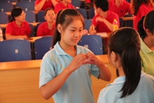 上午8點(diǎn)35分,由實(shí)踐團(tuán)成員鄭岑主講的話劇基礎(chǔ)培訓(xùn)課在階梯教室準(zhǔn)時開課。盡管這是長溝中學(xué)的孩子們第一次接受與話劇有關(guān)的輔導(dǎo)培訓(xùn),但是我們可以明顯地感受到他們對于話劇的濃厚興趣。當(dāng)鄭岑向大家提問“聽到‘話劇’這個詞的第一感覺”時,孩子們紛紛舉手發(fā)言,給出了“優(yōu)美”、“要通過大家的齊心協(xié)力來完成”等令人滿意的答案。