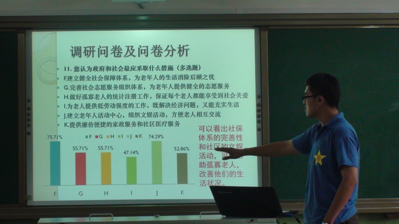 調研三組的同學們以真情表演感動大家,他們將幾日的亮點活動和遇到的各種問題用一幕又一幕的短劇展現出來,還使用PPT來輔助展示,不僅有內容,更是有新意,真實感人。短劇表演將場面氣氛推向了高潮。一直兢兢業業的支教組與日夜奮戰的宣傳組,也通過自己獨有的形式展現了自己的成果。支教組用PPT的形式展示大家幾日來的成果,例如實踐分團的同學們帶領當地孩子們折了100多朵玫瑰花,50個紙飛機,繡有“奮斗”的十字繡等等,讓同學們了解了他們的辛苦和成就。一直在幕后工作的宣傳組通過在夜間寫字的特有方式,向大家展示出獨有的特色,6段總長約為40分鐘的視頻,15份新聞通訊稿,無數張記錄精彩瞬間的照片,豐富多彩的微博消息等等,這些都是靠宣傳組的苦戰才能及時完成的。