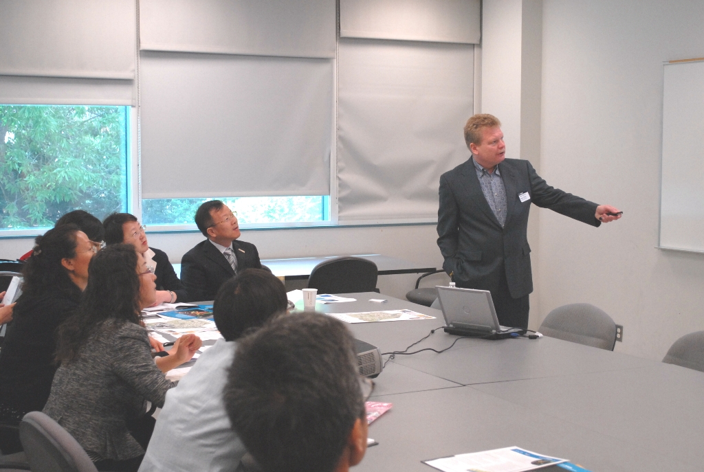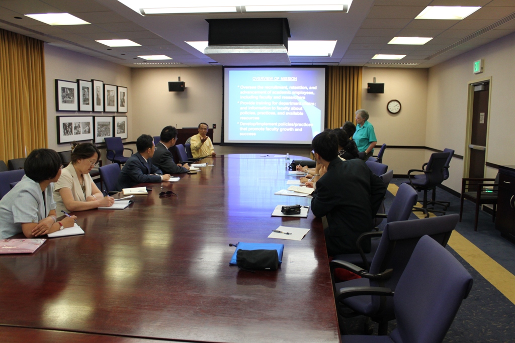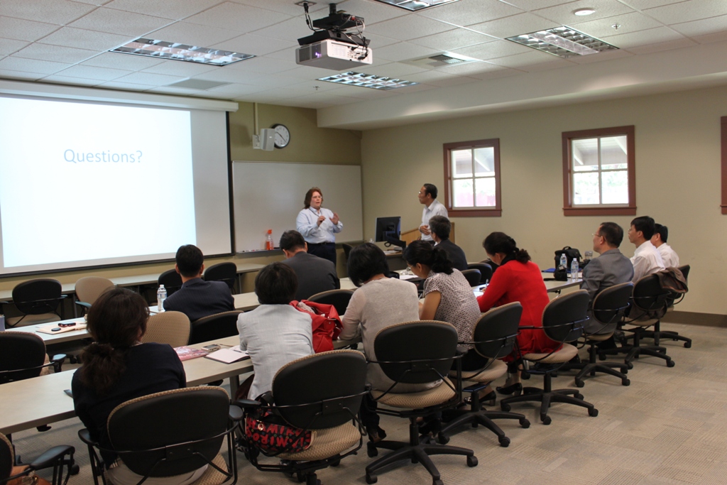 精彩的報告讓團員們忘卻了疲勞,第二天又精神飽滿地聽取了該校戴維斯分校人力資源部埃爾恩•湯普遜(Irene Horgan-Thompson)部長關于福利待遇、崗位管理和發展的專題報告。該??沙掷m發展中心主任、國際著名政治學教授拉里•伯曼(Larry Berman)教授就美國現有的政治體制、高等教育體制和高等教育的層次構成及辦學特色、現狀等問題,做了全面系統的解讀,使培訓團成員全景式地了解到當下美國的政治經濟及高等教育狀況。團員們珍惜每個學習機會,課堂上踴躍提問,和教授們交流熱烈。