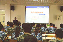 此次活動有兩個部分,第一是參考咨詢部的張國臣老師為同學們做“如何充分利用圖書館資源”的講座;第二是由張老師帶領同學們參觀圖書館閱覽室和借書區。