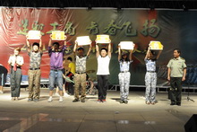 文藝演出開始,大屏幕上播放了2011級學(xué)生的軍訓(xùn)生活錄像。屏幕上同學(xué)們訓(xùn)練的點(diǎn)點(diǎn)滴滴,引起場下同學(xué)的強(qiáng)烈共鳴。伴隨著隆隆的鼓聲,六個軍訓(xùn)營的營旗齊登場,擊鼓表演《威風(fēng)鑼鼓》正式拉開演出帷幕。此時的臺下,各營都在高聲吶喊自己的口號,場面熱鬧非凡。