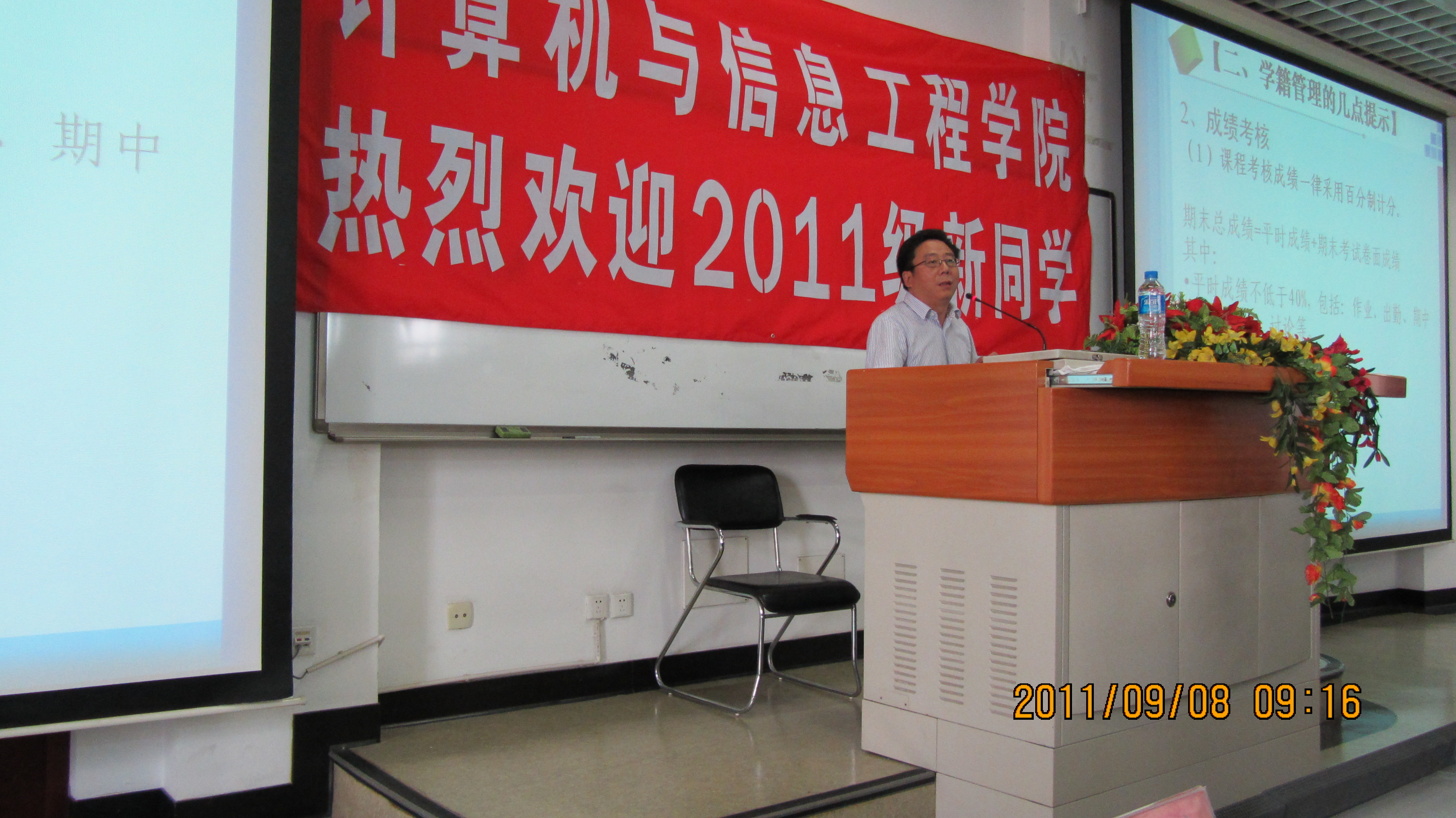 在會上,黨總支書記陳誼教授致開幕詞歡迎2011級新生,她針對為什么學、學什么、怎么學三個方面展開講話,強調了大學生要進行科學系統的職業生涯規劃,學習知識提升能力,精細規劃追求卓越,提升素質全面發展,要盡快熟悉計信學院這個大家庭,希望新生們在大學學習生活中腳踏實地,不斷提高培養創新實踐能力。受劉載文院長的委托,陳書記向新生介紹了學院的整體情況。教學副院長姜同強教授則就新生最關心的課程安排及學業規劃做詳細的說明,要求各位新生要努力學習專業知識,嚴格遵守校規校紀。黨總支副書記鄭喜姣老師也提出對學生提出了幾點期望,希望各位同學以成長成才為目標,全方面提升自己的綜合能力,增強自己的契約意識、進取意識和進取意識,成為對社會有用的棟梁之才。