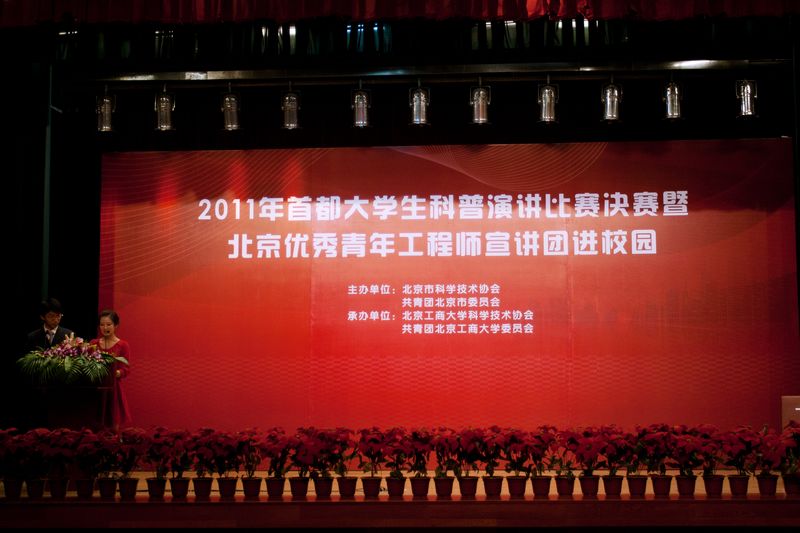 9月24日上午,2011年首都大學生科普演講比賽決賽暨北京優秀青年工程師進校園活動在北京工商大學隆重舉行。活動由北京市科學技術協會、共青團北京市委員會共同主辦,北京工商大學科學技術協會與共青團北京工商大學委員會承辦。中國科協發展研究中心主任調研宣傳部副部長王康友,北京市科協科普部副部長姚儀鸞,共青團北京市委員會大學部副部長張賀鋒,北京科技咨詢中心副主任何素興,中國工程院院士、北京工商大學副校長孫寶國,北京工商大學副校長謝志華、李朝鮮、方德英出席了本次演講比賽。