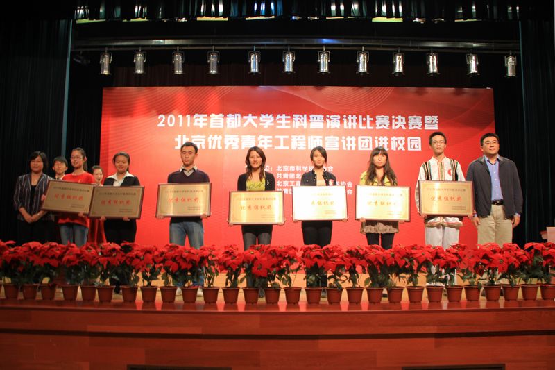 北京市科協科普部姚儀鸞副部長和團市委大學部張賀鋒副部長為獲得優秀組織獎的學校頒獎;北京市科協何素興副主任和北京工商大學方德英副校長為優秀組織個人獎的獲獎單位頒發了榮譽證書;殷之光老先生和北京工商大學謝志華副校長為獲得本次比賽一等獎的10名演講者頒發了獎杯。