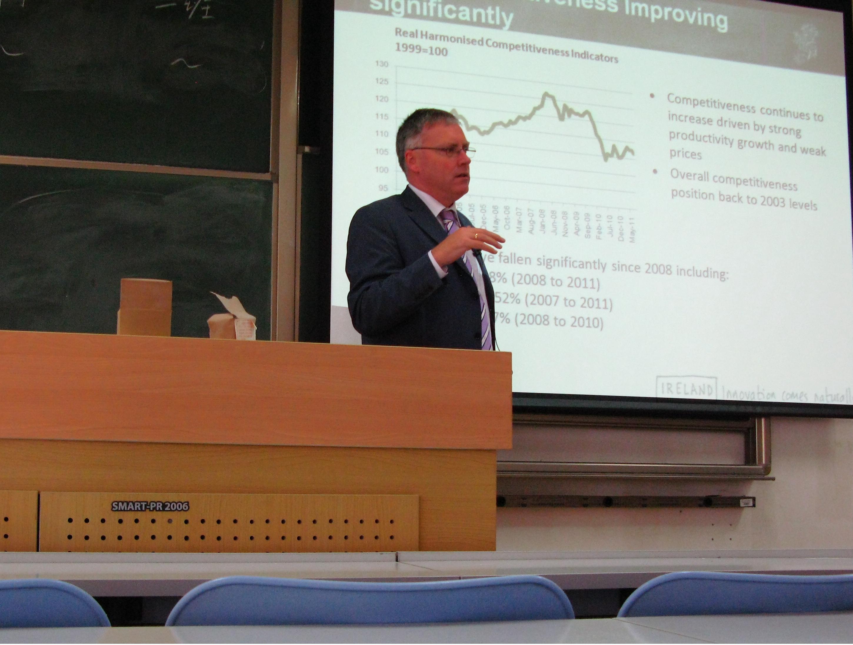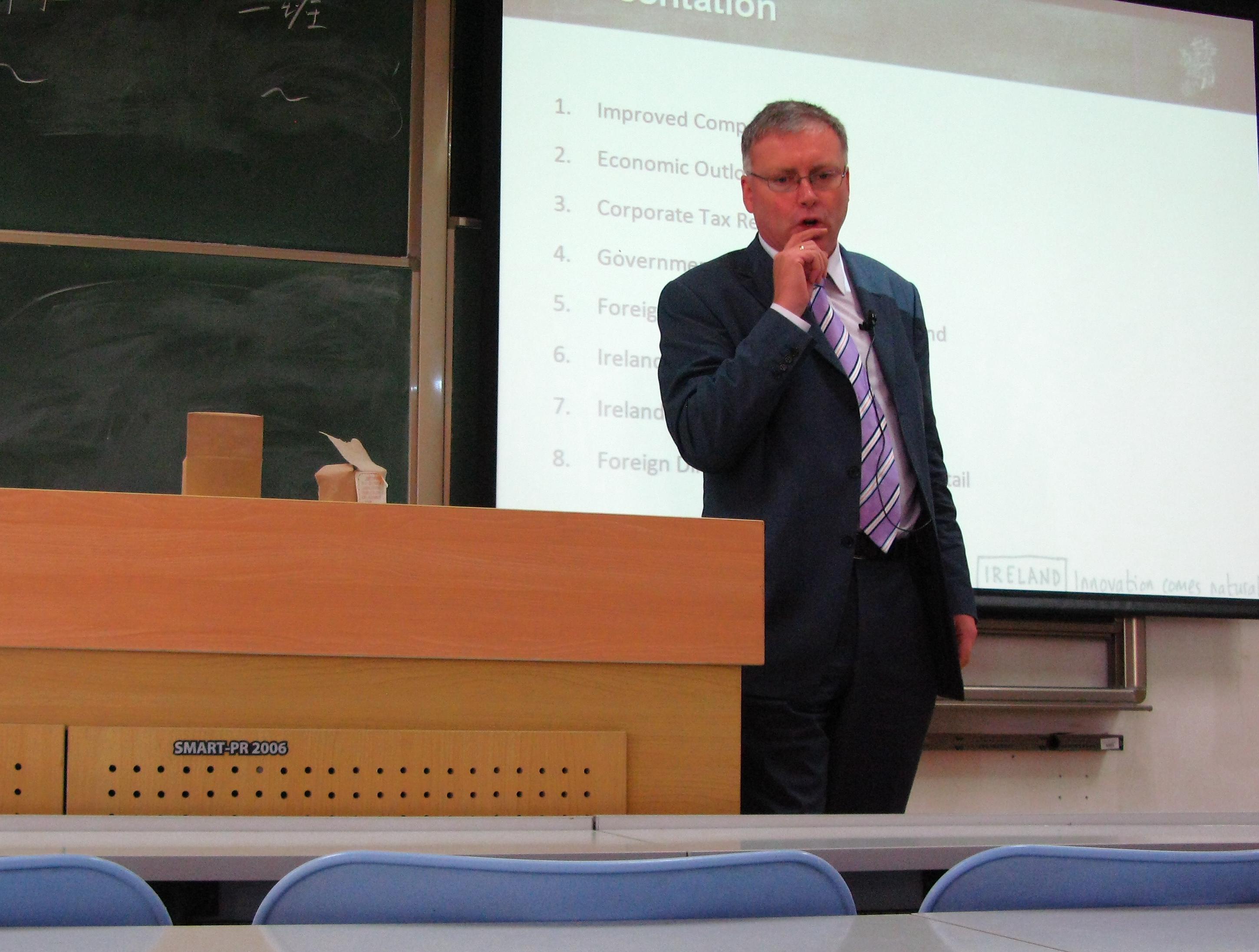 何瑞副校長以樂觀積極的視角對金融危機(jī)后愛爾蘭經(jīng)濟(jì)復(fù)蘇的勢頭進(jìn)行了綜合分析,從愛爾蘭經(jīng)濟(jì)的競爭力、愛爾蘭經(jīng)濟(jì)概況、企業(yè)稅收制度、政府計(jì)劃、愛爾蘭外資直接投資、愛爾蘭的國際競爭力和愛爾蘭的經(jīng)濟(jì)優(yōu)勢等七個(gè)方面向我校教師和研究生介紹了愛爾蘭的經(jīng)濟(jì)現(xiàn)狀和未來的發(fā)展前景。何瑞副校長對愛爾蘭經(jīng)濟(jì)復(fù)蘇和未來增長充滿了信心。他認(rèn)為,由于愛爾蘭公司運(yùn)營成本較低、產(chǎn)品出口強(qiáng)勁增長、內(nèi)向型FDI穩(wěn)定增長、在愛大型國際公司業(yè)務(wù)穩(wěn)定發(fā)展以及良好的高新技術(shù)發(fā)展環(huán)境等優(yōu)勢,愛爾蘭經(jīng)濟(jì)已經(jīng)開始增長,樂觀預(yù)期2011年其GDP增長率將達(dá)到1.8%。隨后的提問環(huán)節(jié)中,在座的師生就自己感興趣的問題向何瑞副校長進(jìn)行了熱烈的討論。