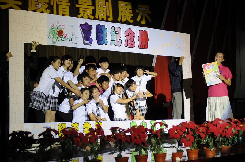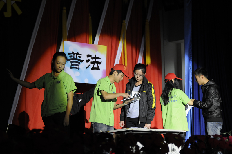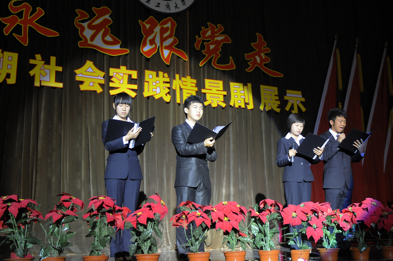在暑期社會實踐成果展示環(huán)節(jié)中,9個學院參加暑期社會實踐的同學們利用視頻展示、情景短劇表演、歌舞、三句半、朗誦和新聞播報等別具一格、創(chuàng)意新穎的形式展示了他們的暑期社會實踐成果。其中,計算機與信息工程學院實踐分團還邀請到了實踐基地——佛子莊中心校的4名小同學一起進行匯報表演,再現(xiàn)了暑期社會實踐的點點滴滴。