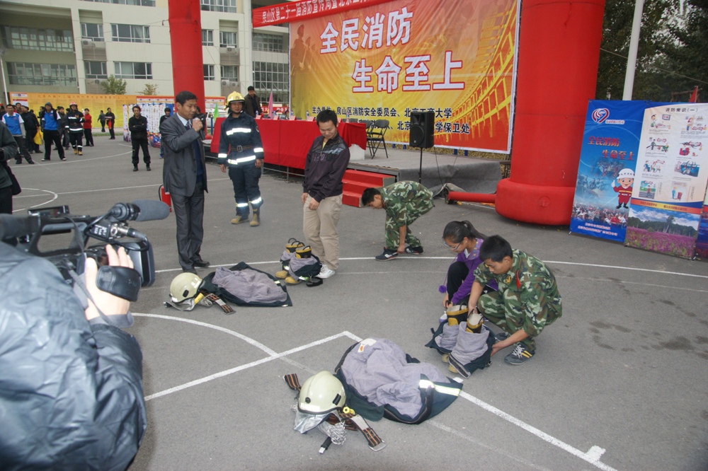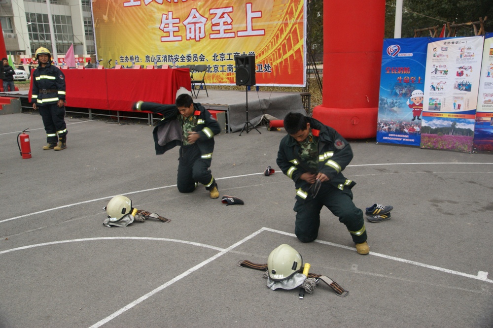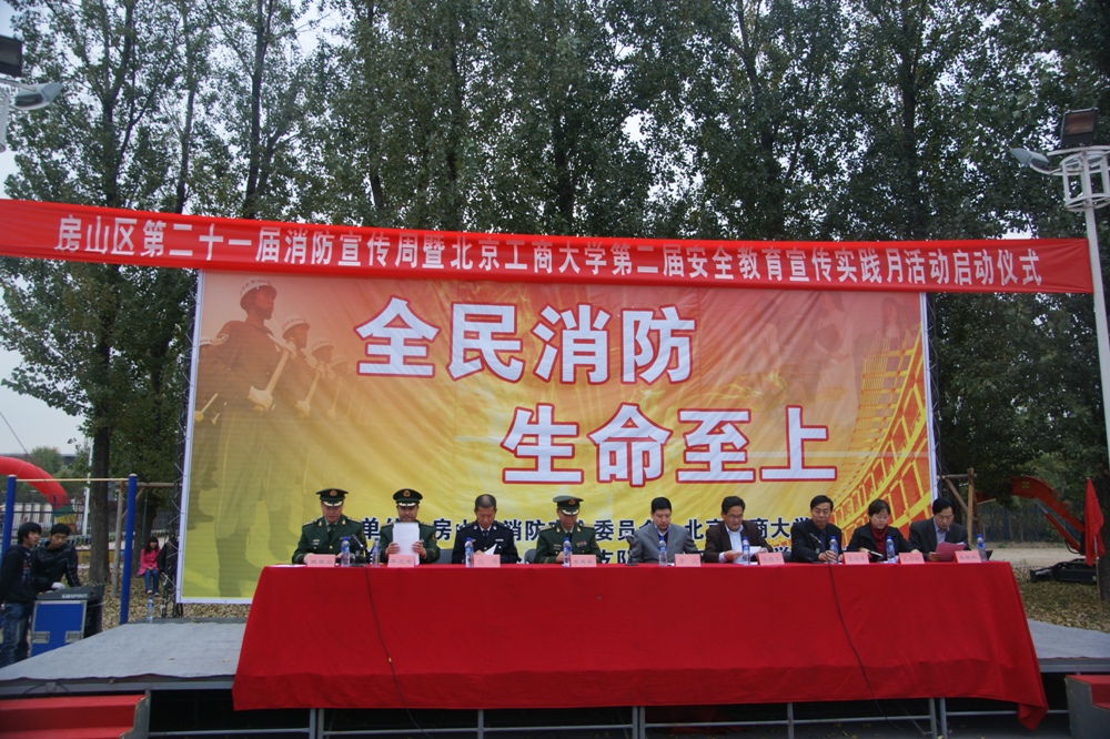 11月2日下午,房山區(qū)防火安全委員會(huì)和北京工商大學(xué)共同主辦“房山區(qū)第二十一屆119消防宣傳周”暨“北京工商大學(xué)第二屆安全宣傳教育實(shí)踐月活動(dòng)啟動(dòng)儀式”,并在良鄉(xiāng)校區(qū)生活區(qū)南門外操場(chǎng)組織大一新生及學(xué)校教職工進(jìn)行了大型的消防疏散演習(xí)。北京工商大學(xué)黨委副書記張德玉、房山區(qū)副區(qū)長李江、北京市消防總隊(duì)參謀長李建春、房山區(qū)公安分局副局長閆偉、房山區(qū)“三化兩區(qū)”建設(shè)咨詢委員會(huì)副主任委員高培軍、房山區(qū)消防支隊(duì)政委藏桂叢、房山區(qū)公安消防支隊(duì)長李立志等領(lǐng)導(dǎo)出席了活動(dòng)。