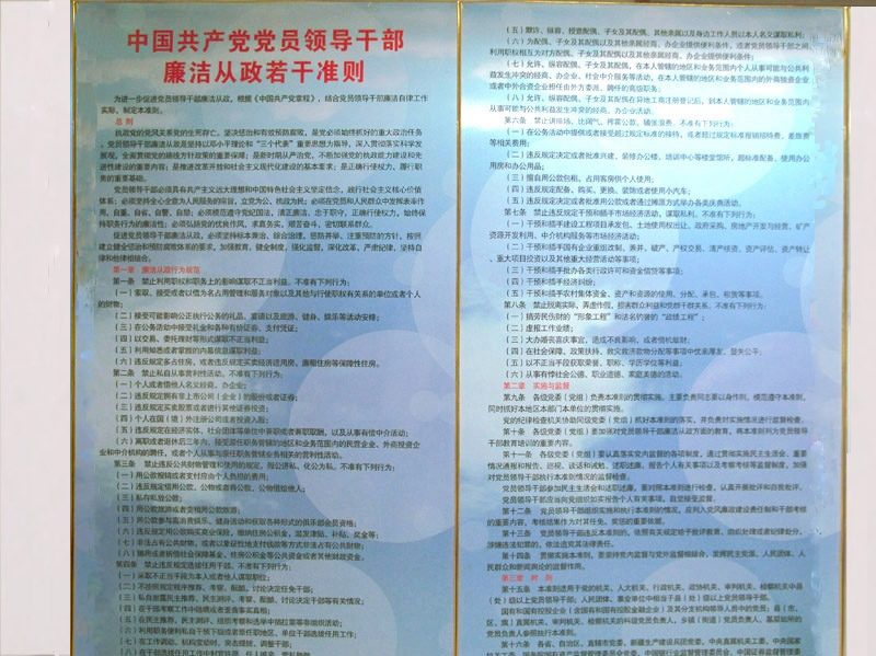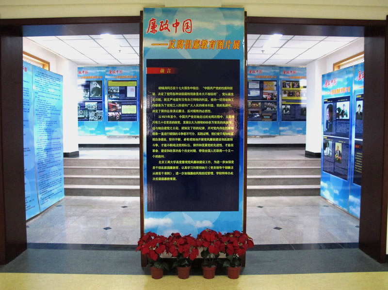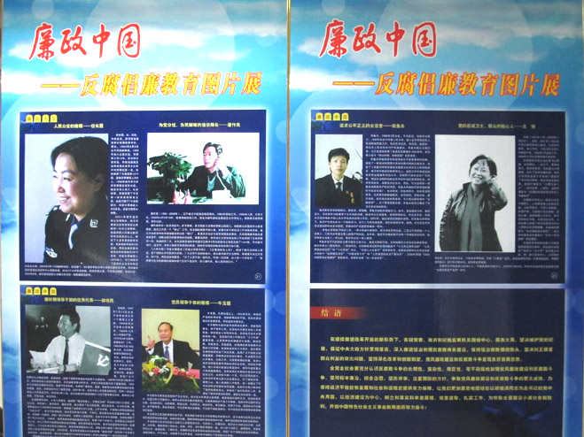 為進一步加強黨員干部反腐倡廉教育,認真學習和貫徹執行《黨員領導干部廉潔從政若干準則》,進一步加強廉政風險防控管理,學校黨委宣傳部、紀委制作了“廉政中國----反腐倡廉教育圖片展”,現在阜成路綜合樓三層展出。