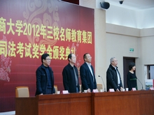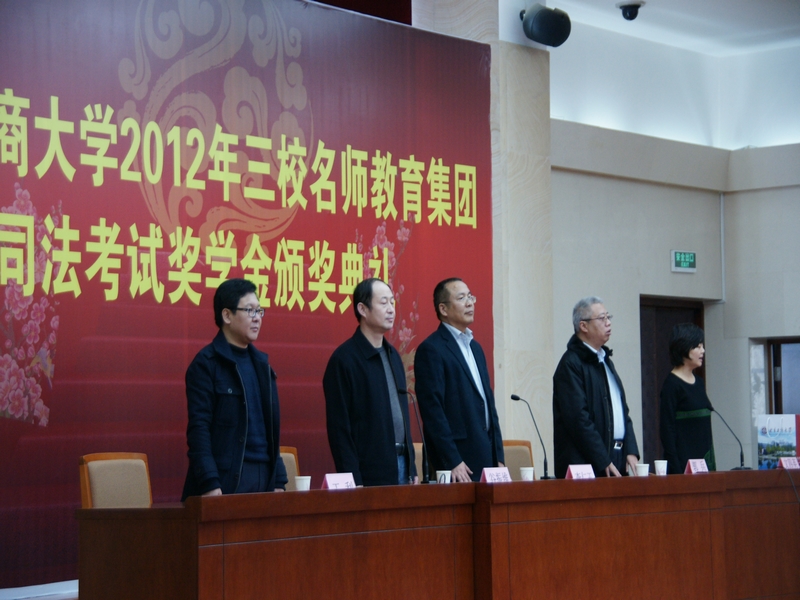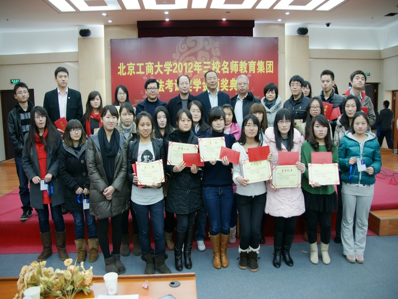 12月7日,北京工商大學2012年三校名師教育集團司法考試獎學金頒獎典禮在良鄉校區模擬法庭舉行。法學院院長李仁玉教授,三校名師教育集團董事長谷振維,三校名師教育集團副總裁郭兵,三校名師教育集團王利校長出席本次典禮。典禮由法學院黨總支副書記文四英主持,法學院09、10、11級全體學生參加典禮。