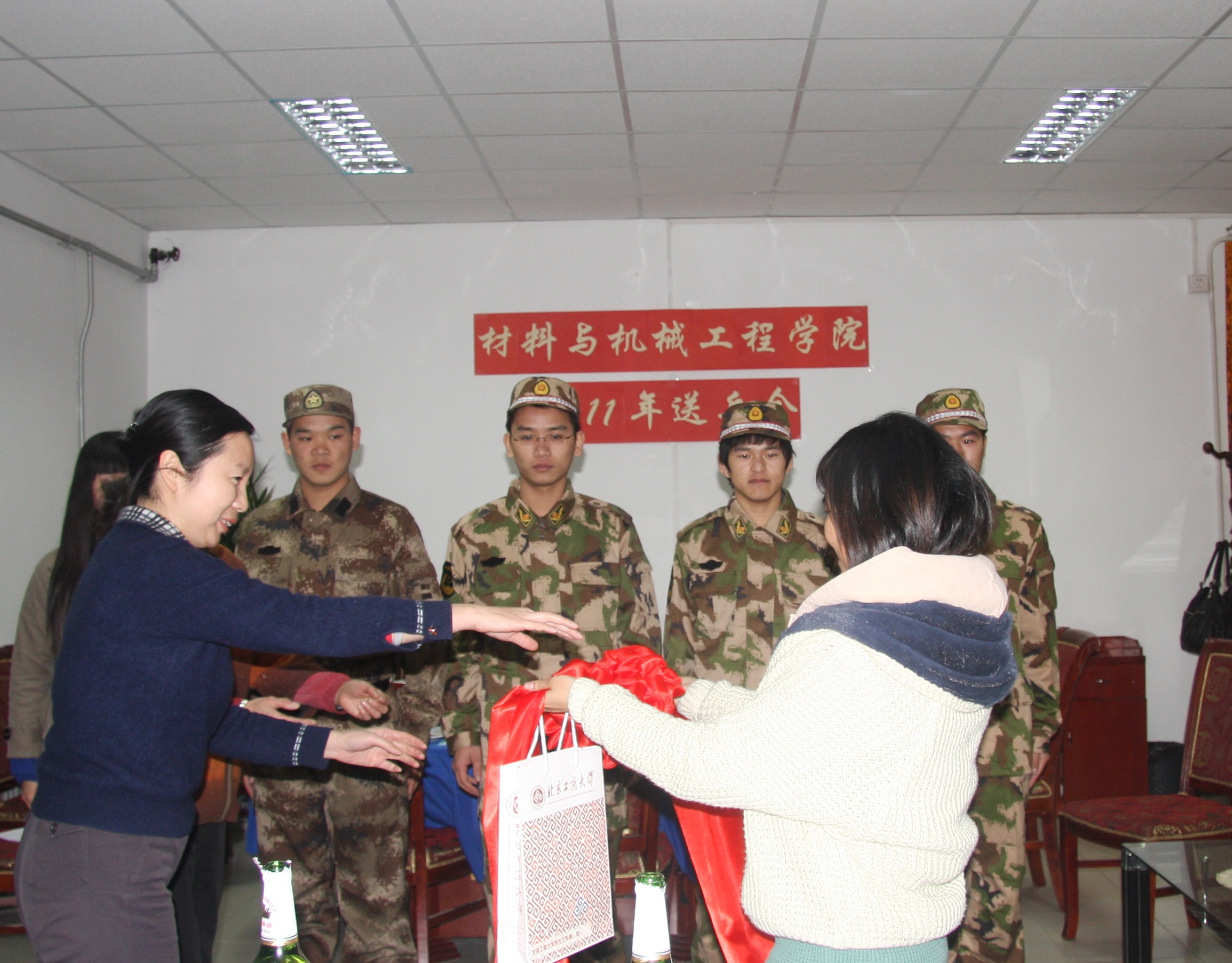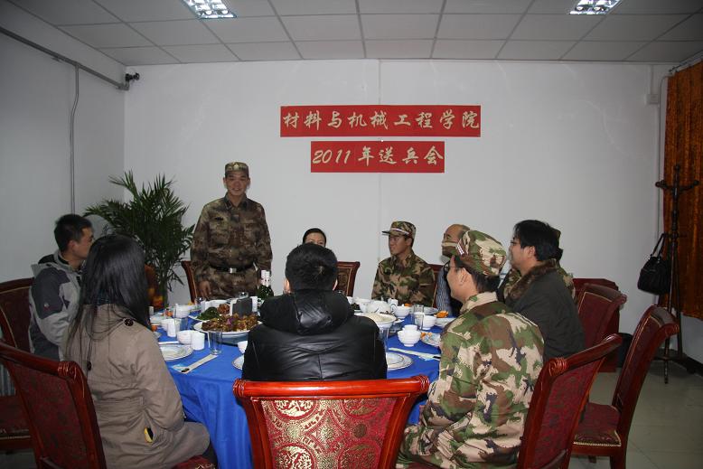 為了迎接老兵,歡送新兵入伍,材機學院于12月8日下午舉行了2011年材料與機械工程學院老兵復員、新兵入伍歡迎歡送會。學院黨總支書記呂東燕、黨總支副書記馬春暉,輔導員、入伍新兵及其班主任、退伍老兵、學生代表參加。