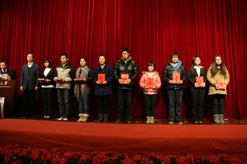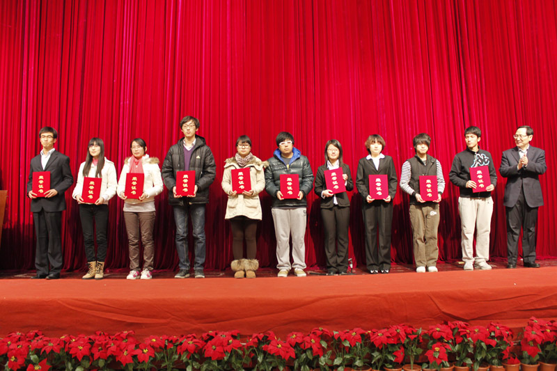 表彰大會在莊嚴的國歌聲中拉開帷幕。首先,李朝鮮副校長宣讀了《關于表彰2010-2011學年本科生先進集體、先進個人的決定》,譚向勇校長、盧思鋒副書記、方德英副校長分別向獲得2010-2011學年校級先進班集體、三好學生、優秀學生干部及獲得國家獎學金的同學頒發了榮譽證書。先進班集體代表材機學院郭文元、國家獎學金獲得者代表商學院向若琪依次進行了發言。
