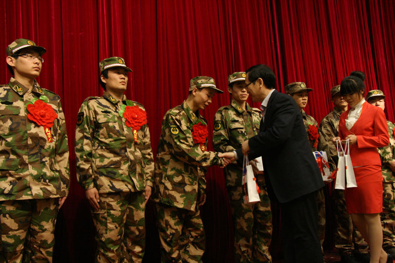 學生處處長呂素香老師對學校新近發布的關于加強班集體建設的四項文件進行了說明。隨后譚向勇校長為高金青等7名兩年前入伍、而今光榮退伍的學生和陳池等20名今年光榮入伍的同學贈送了紀念品,并寄予祝福。校黨委副書記盧思鋒對學校本學年評獎評優情況做了簡要總結,并就新形勢下繁榮校園文化、利用傳統藝術加強學生愛國主義教育談了自己的體會。
