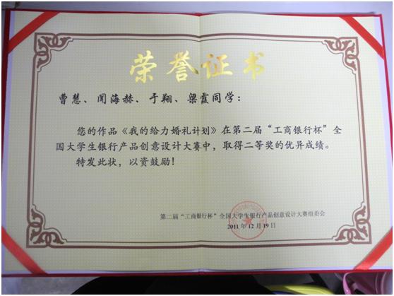 12月19日,第二屆“工商銀行杯”全國大學生銀行產品創意設計大賽頒獎典禮在對外經貿大學舉行,我校經濟學院10級研究生曹慧、聞海赫與中國人民大學的于翔和梁霞組隊參賽,團隊設計的《我的給力婚禮計劃》獲得全國二等獎的好成績。