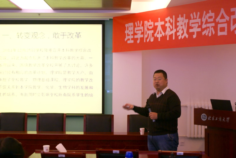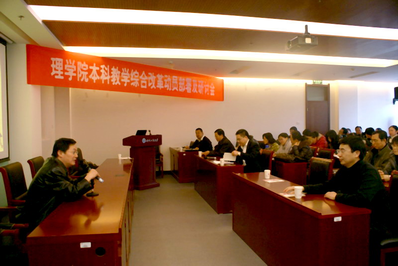 李寶河副院長對理學院本科教學綜合改革工作做了具體的部署和安排。他要求各系做好充分的調(diào)研,下學期開學初要拿出修訂后的各專業(yè)培養(yǎng)方案。另外他指出理學院還承擔了全校數(shù)學、物理、化學基礎課程,理學院基礎課程的改革對其他院系學生的培養(yǎng)有著舉足輕重的作用,因此數(shù)學物理等基礎課程的改革勢在必行。他對基礎課程的改革提出了具體的思路,特別是課堂教學,他向全體教師介紹了國際上一種先進的基礎課程大班教學中采用的“同伴教學法”,并計劃在下學期在部分課程中試點。