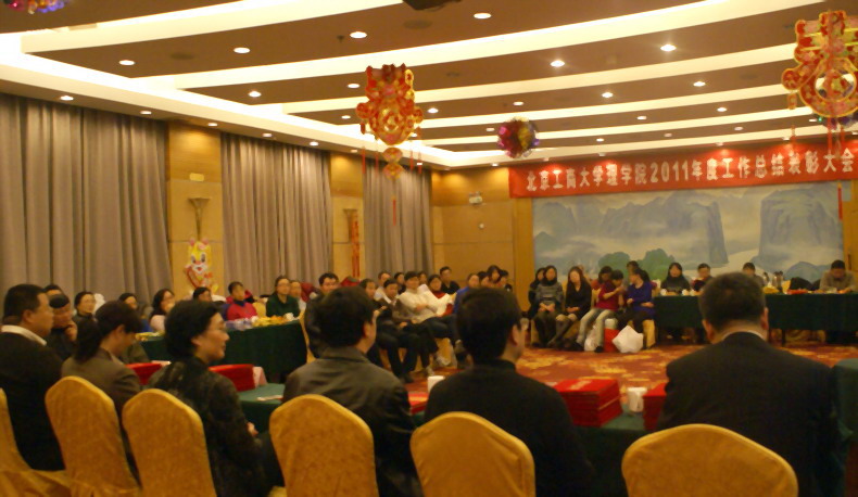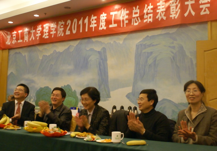 曹顯兵院長在總結報告中回顧了一年來理學院在教學科研、學科建設方面所做的工作。他說,2011年理學院共完成教學工作量20303標時,科研分數15513分,折合科研工作量42972標時,完成教學科研總工作量63275標時,超工作量達25874標時;年度科研到位經費647萬元,其中縱向經費268萬元,橫向經費379,獲批得國家自然科學基金項目6項,北京市自然科學基金2項;在學校本科教學優秀獎評選中榮獲一等獎3個,二等獎5個。